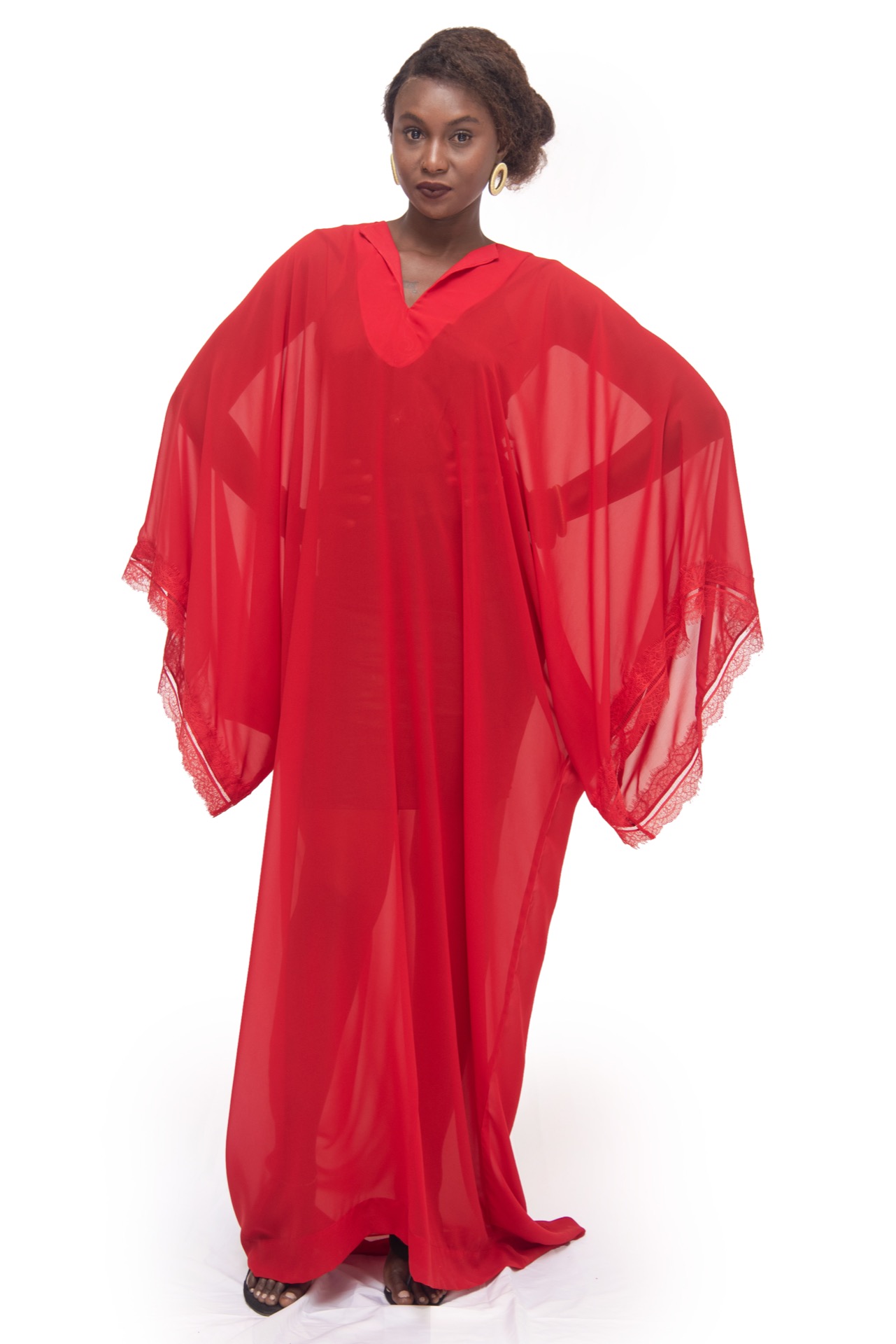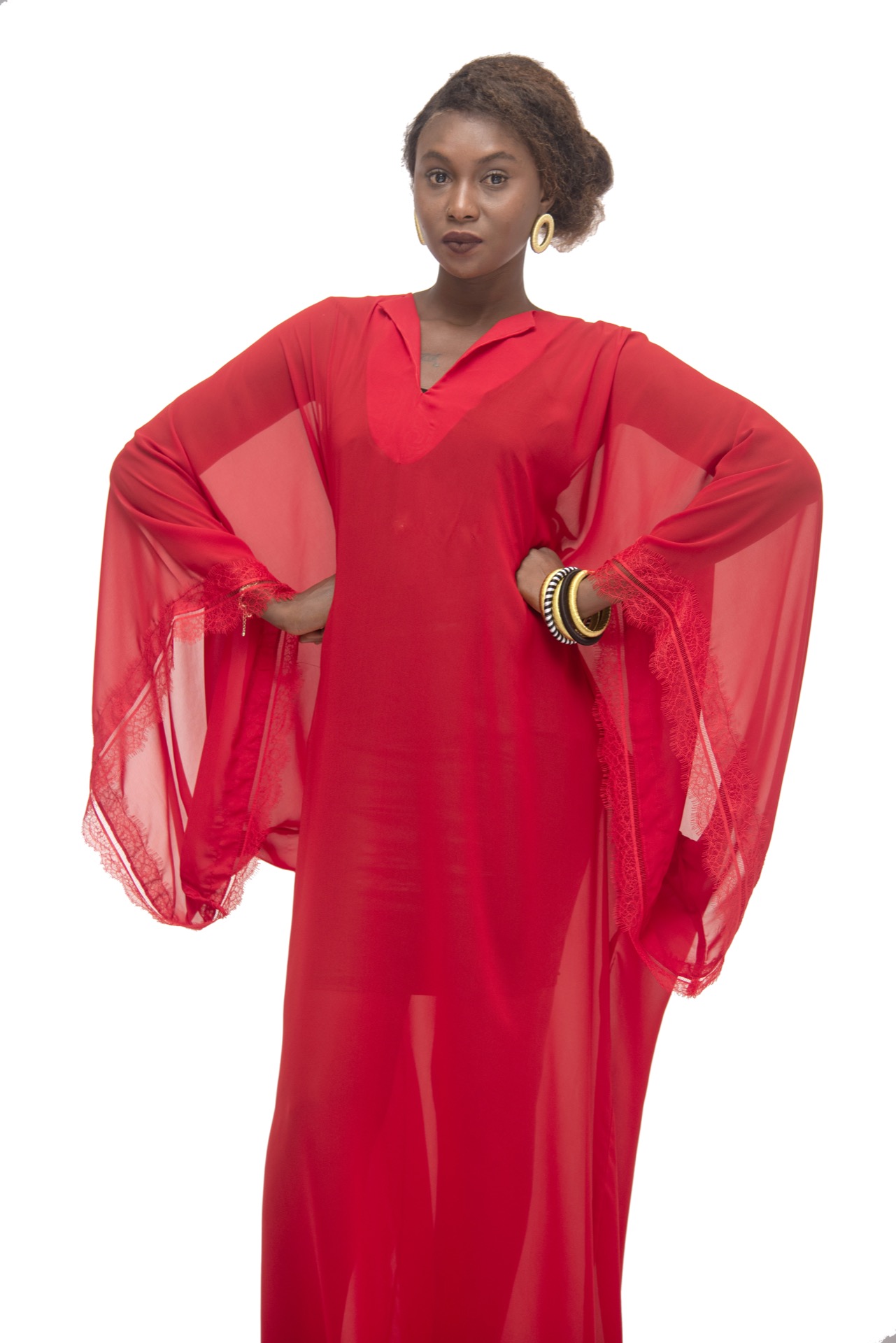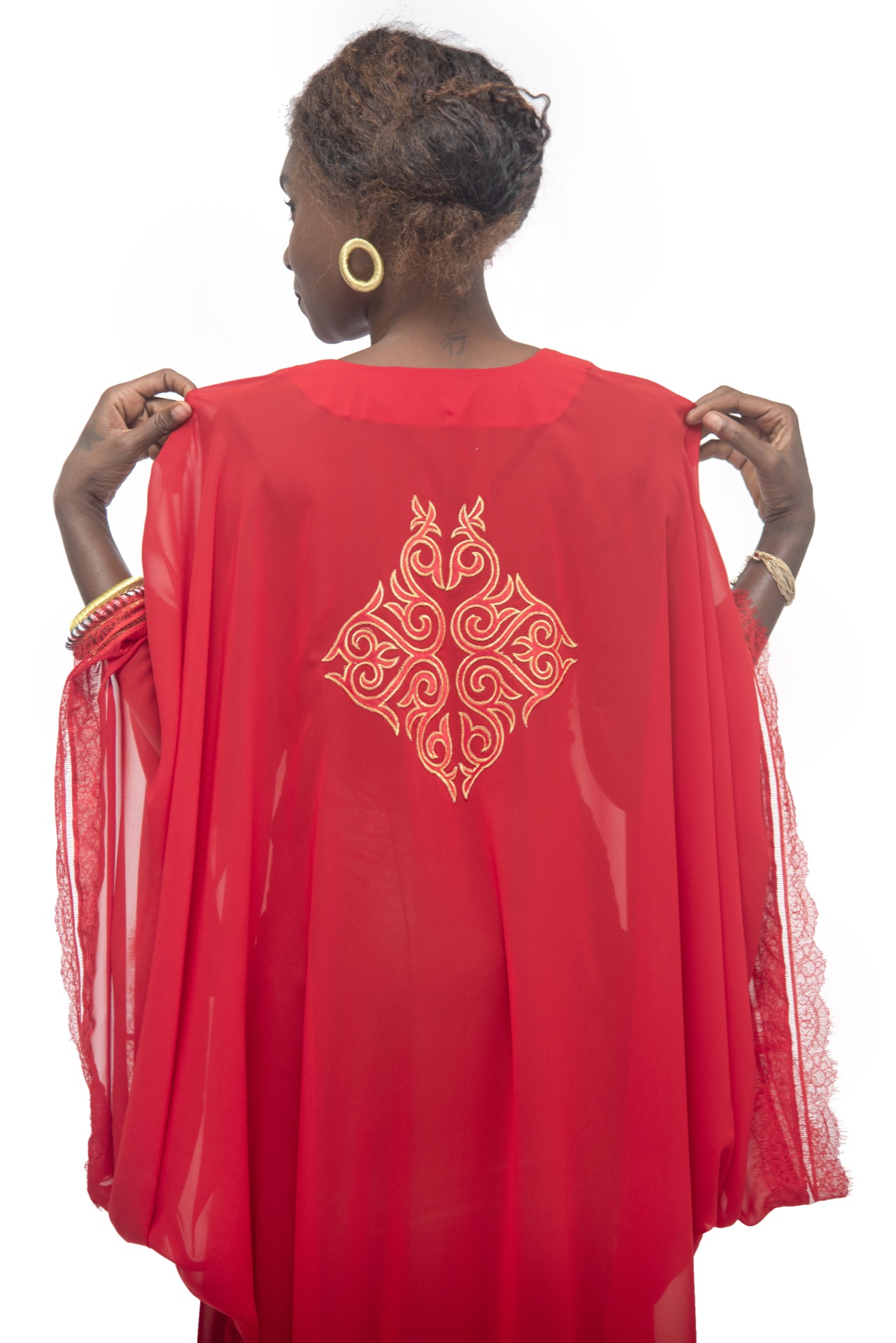 Boubou fluide en Chiffon de soie ornement dentelle et motif dans le dos