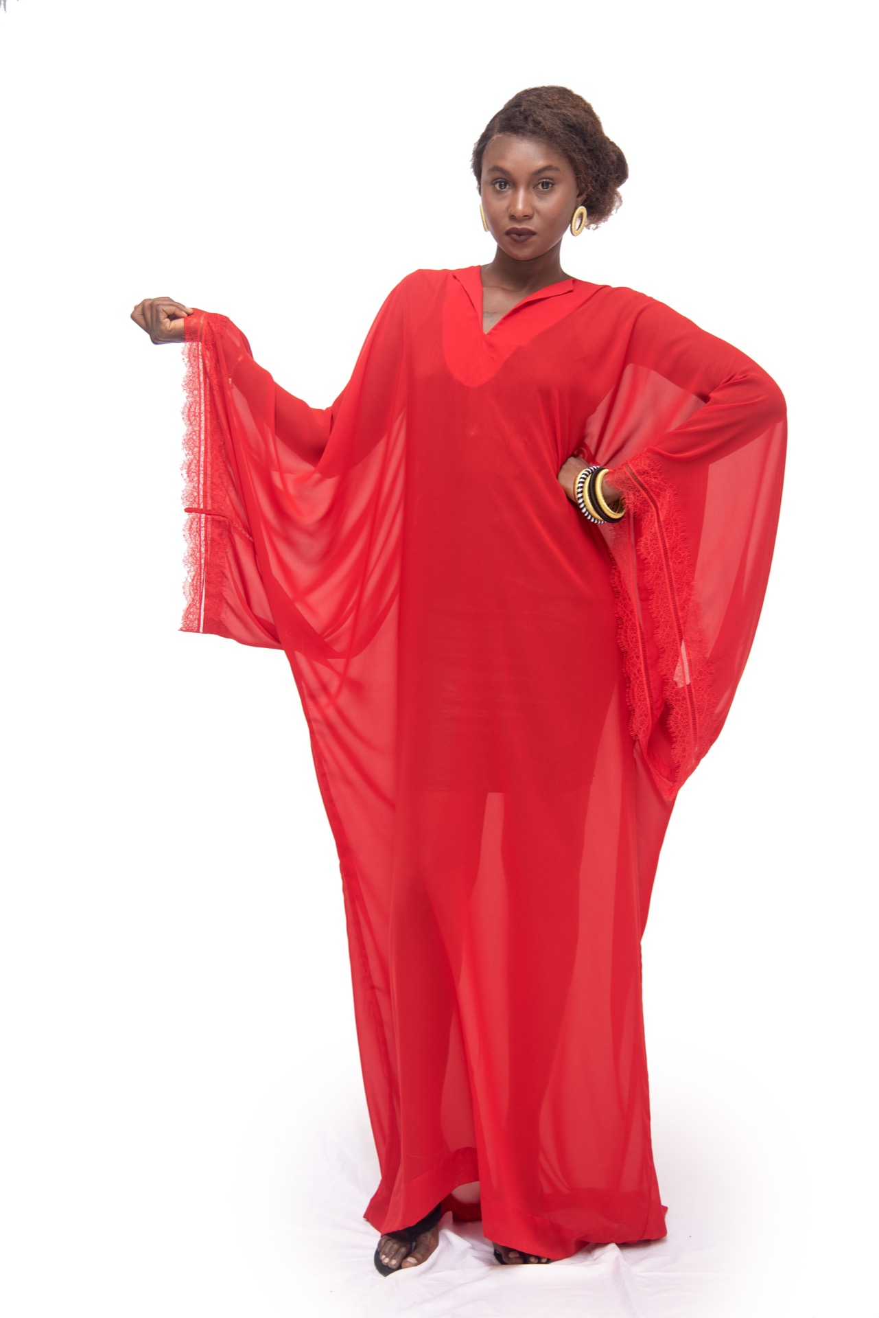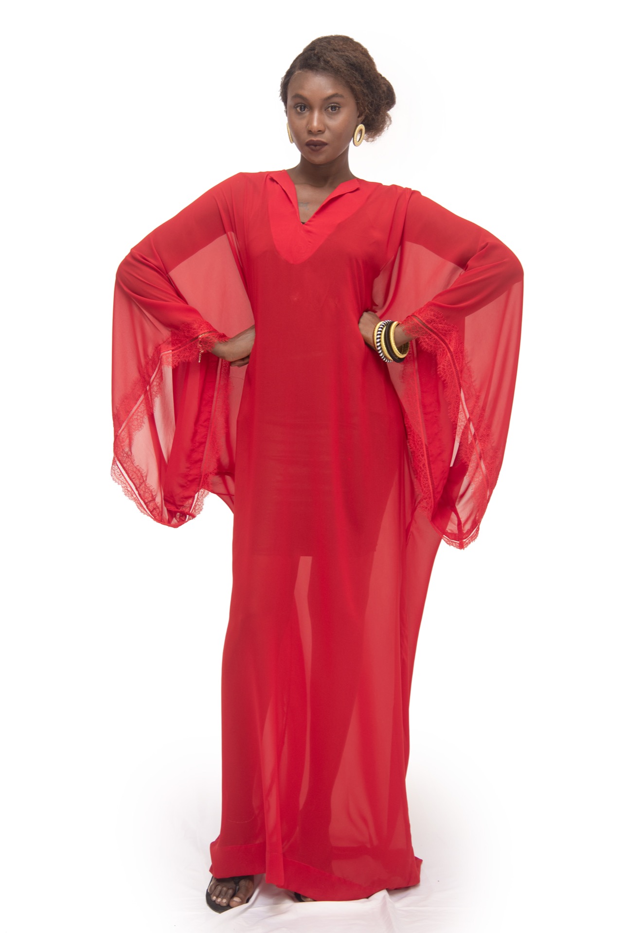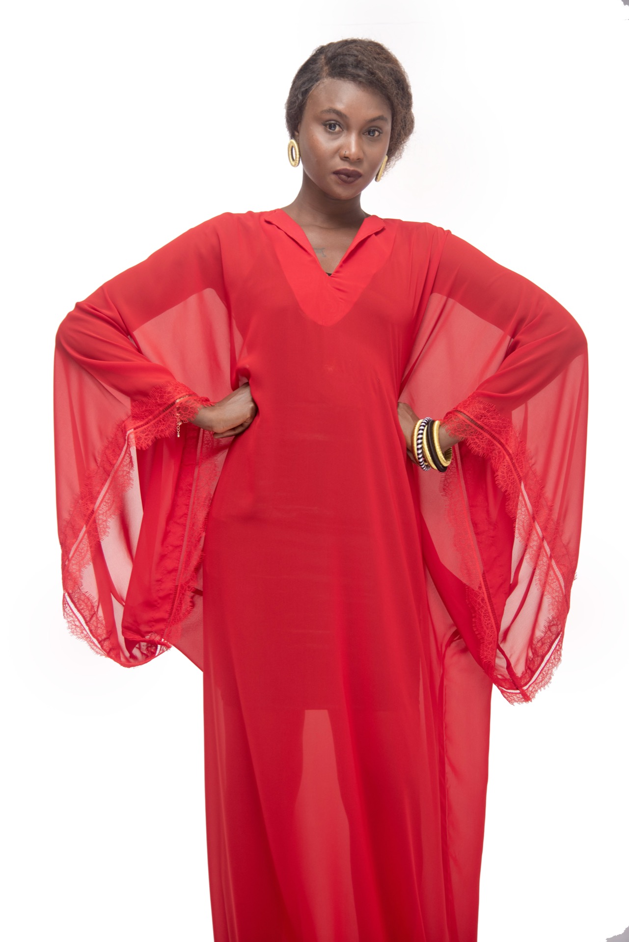 Boubou fluide en Chiffon de soie ornement dentelle et motif dans le dos