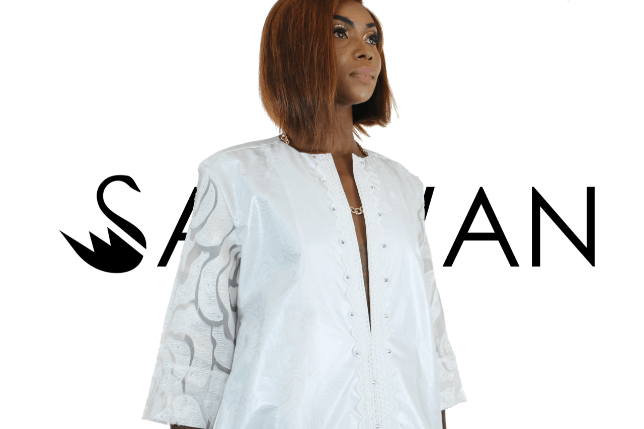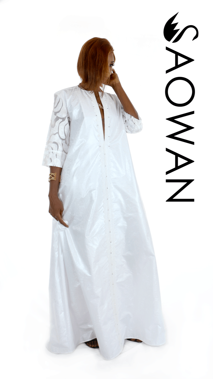 Robe trapèze en Getzner Blanc aux manches en brocard Organza avec une doublure en soie blanche. Idéal pour les heureux évènements